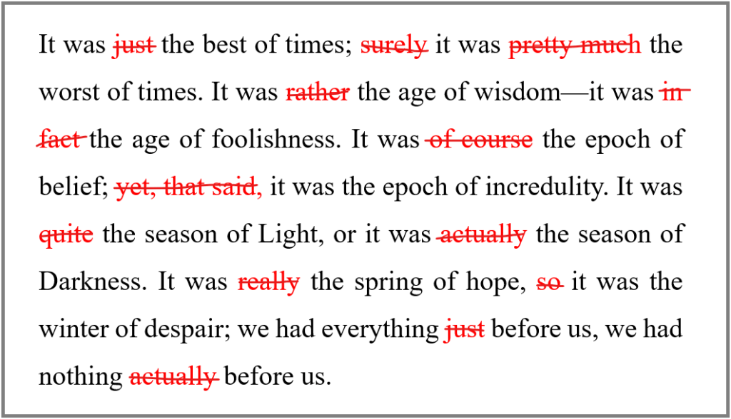In Dreyer’s English, longtime copy chief of Random House Benjamin Dreyer suggests an exercise for both writers and editors: to spend one week without using “throat clearers” in writing or speech. If you take out these little words and find there isn’t much substance remaining, it may be time to rework the sentence.